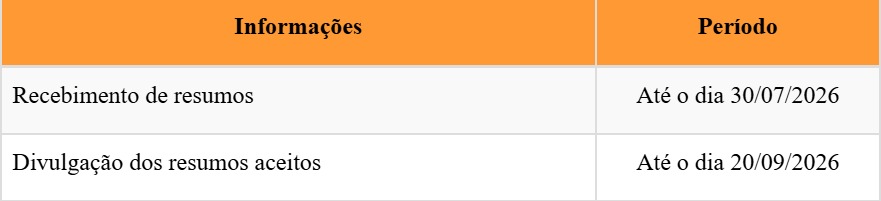 - Não há limite máximo de autores por resumo. Atenção: não será permitida a inclusão de novos coautores após a aceitação do trabalho.